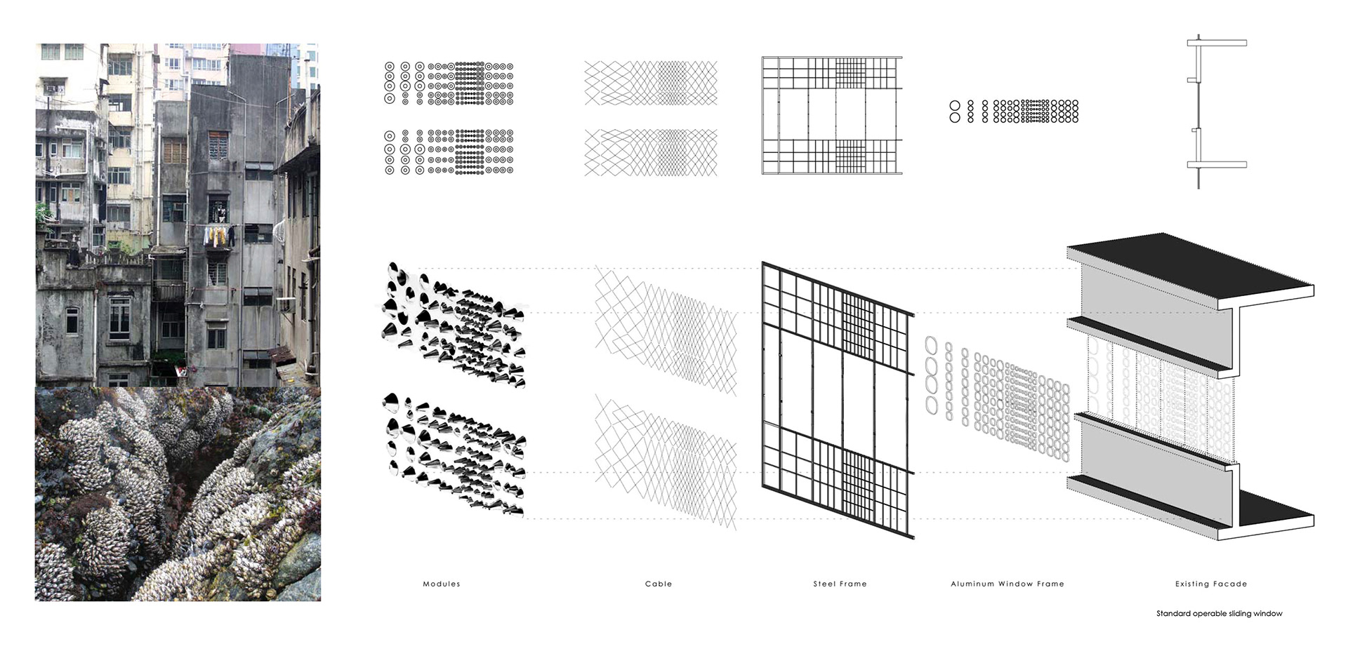 The client requested a low cost renovation of the building exterior and interior. The proposal reimagined the building facade as seaside barnacle on rock surface. The chrome modules were designed and able to be installed with local construction techniques. The resulting effect was a low cost faceted surface that brings the building a new luxurious outlook.